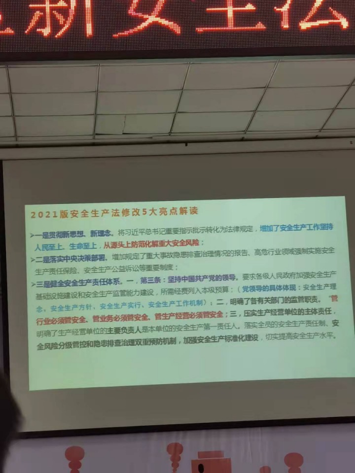 日開展新《安全生產(chǎn)法》知識專題培訓(xùn),進(jìn)一步宣傳貫徹新《安全生產(chǎn)法》的實施,有效落實安全生產(chǎn)職責(zé),提升安全生產(chǎn)防范意識,有效防范和遏制安全生產(chǎn)事故發(fā)生。